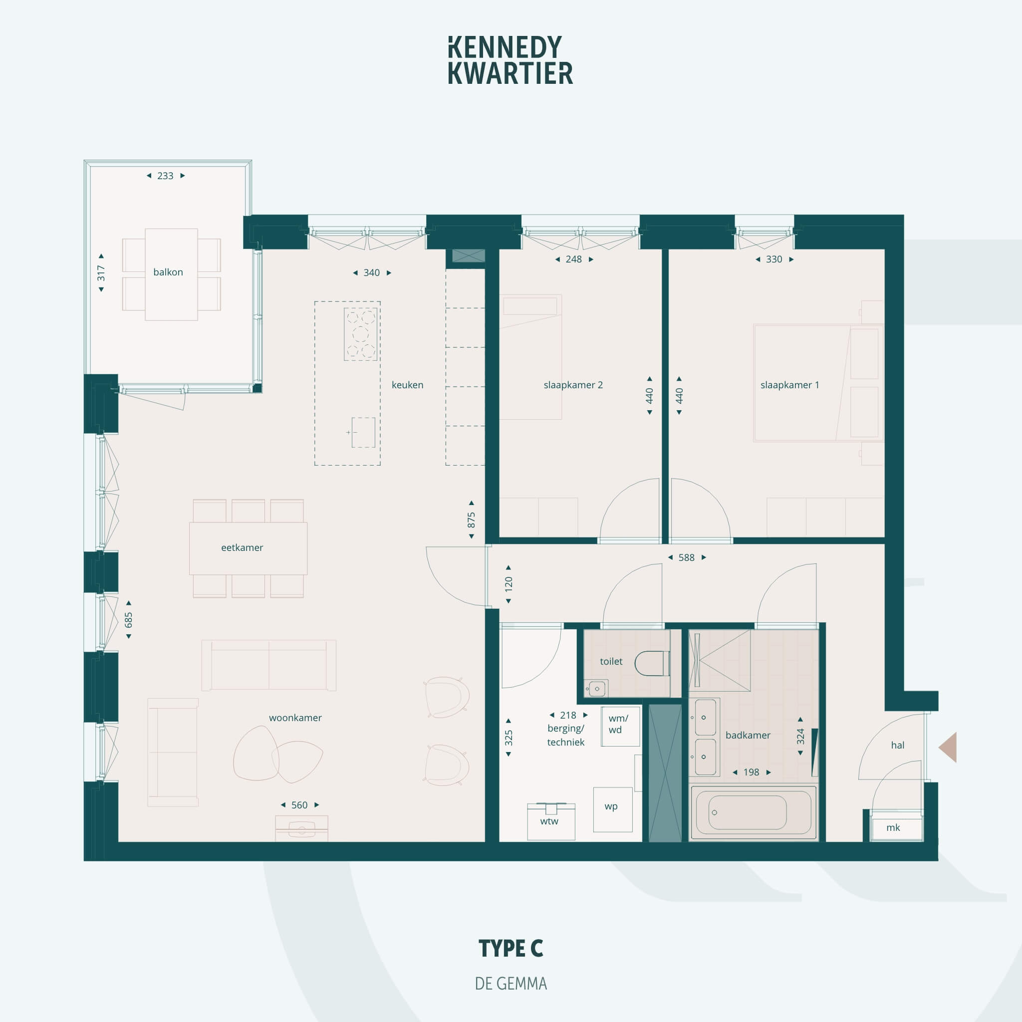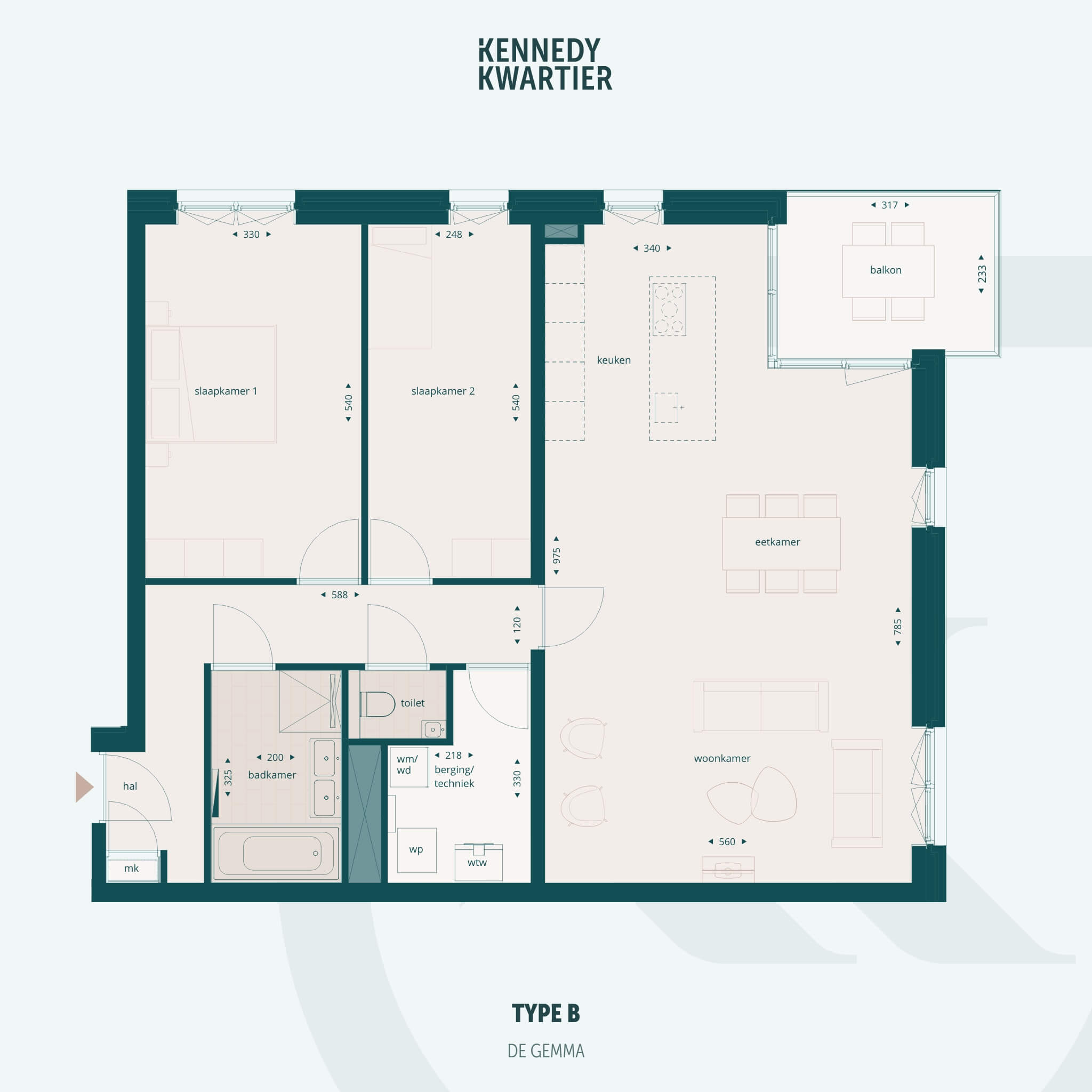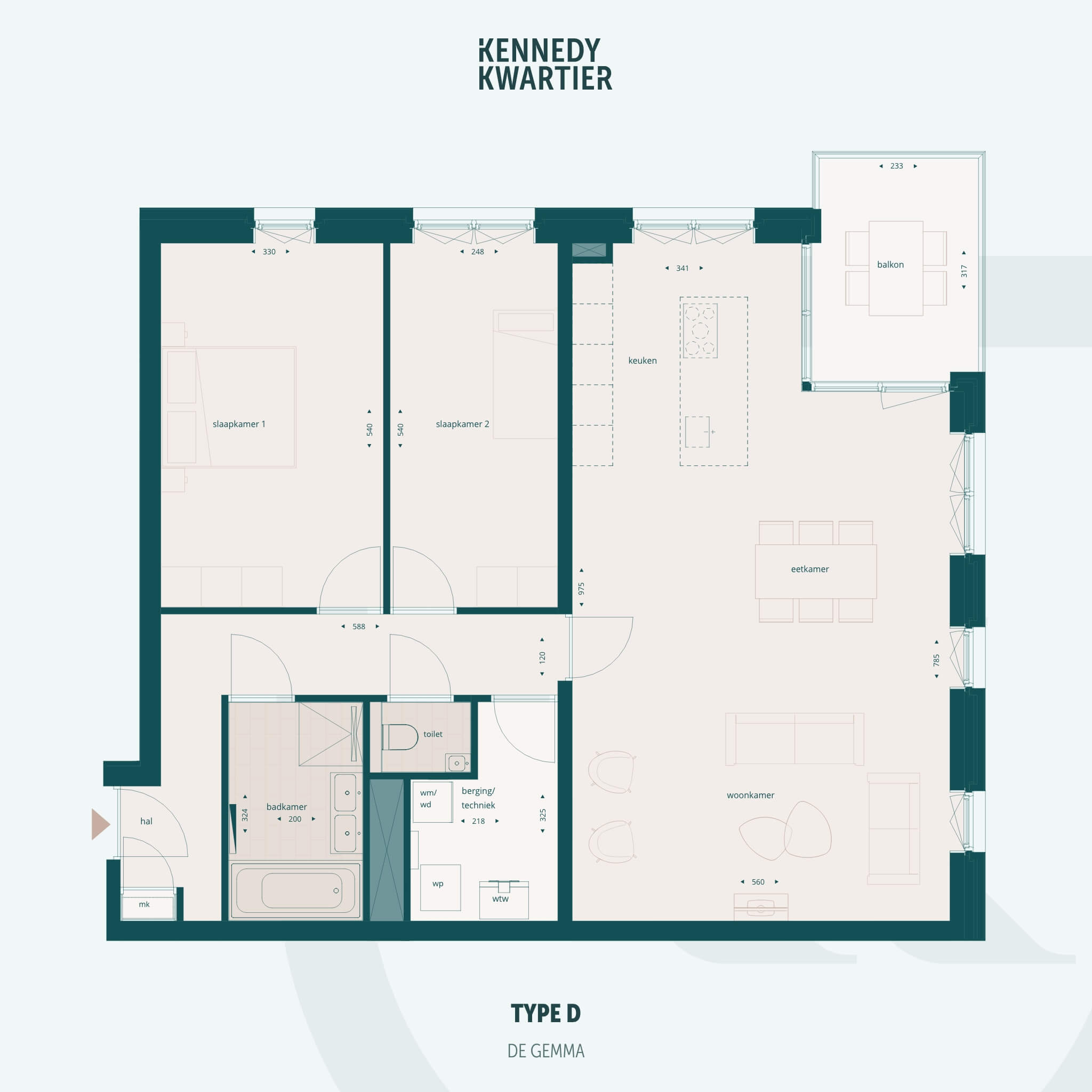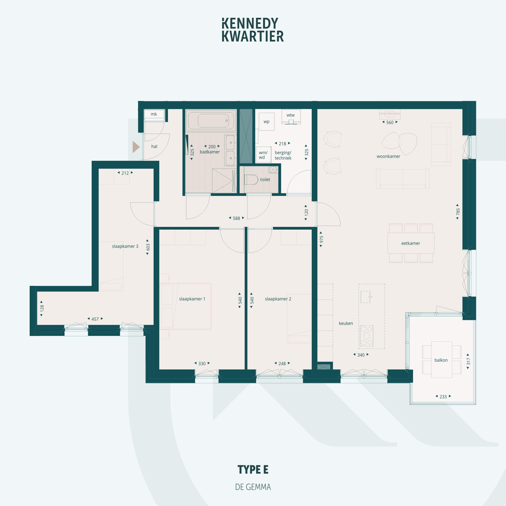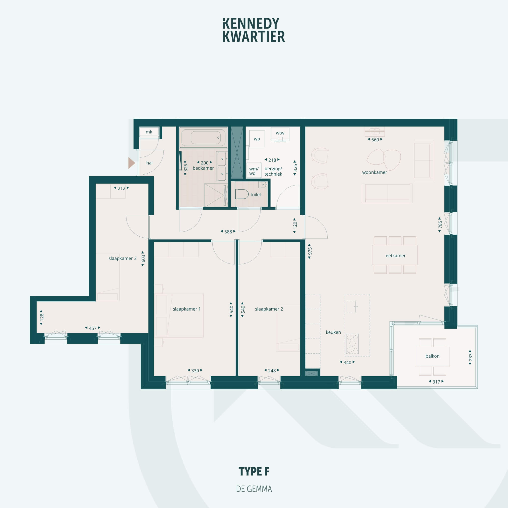 Het balkon ligt op de hoek van het gebouw en biedt een beschutte buitenplek om te ontspannen. De hoofdslaapkamer is royaal en licht. Daarnaast beschikt dit appartementstype over een tweede én derde slaapkamer, die flexibel in te richten zijn naar uw wensen.