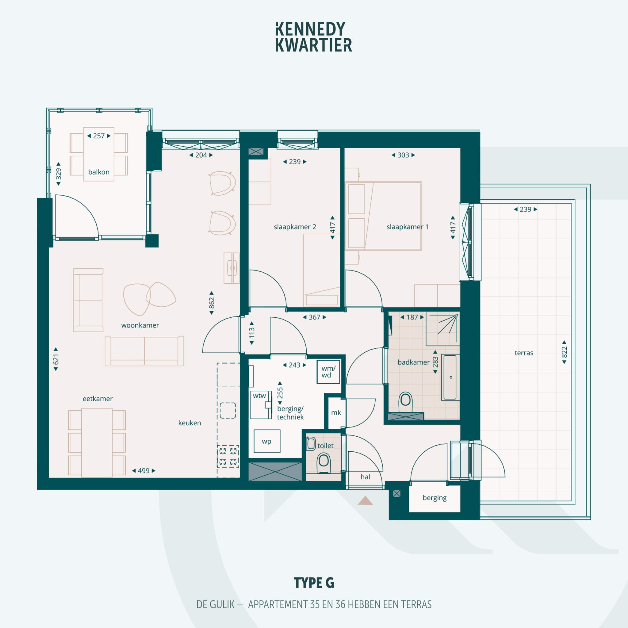 Appartementen 35 en 36 hebben naast het balkon een ruim terras van circa 19 m².
